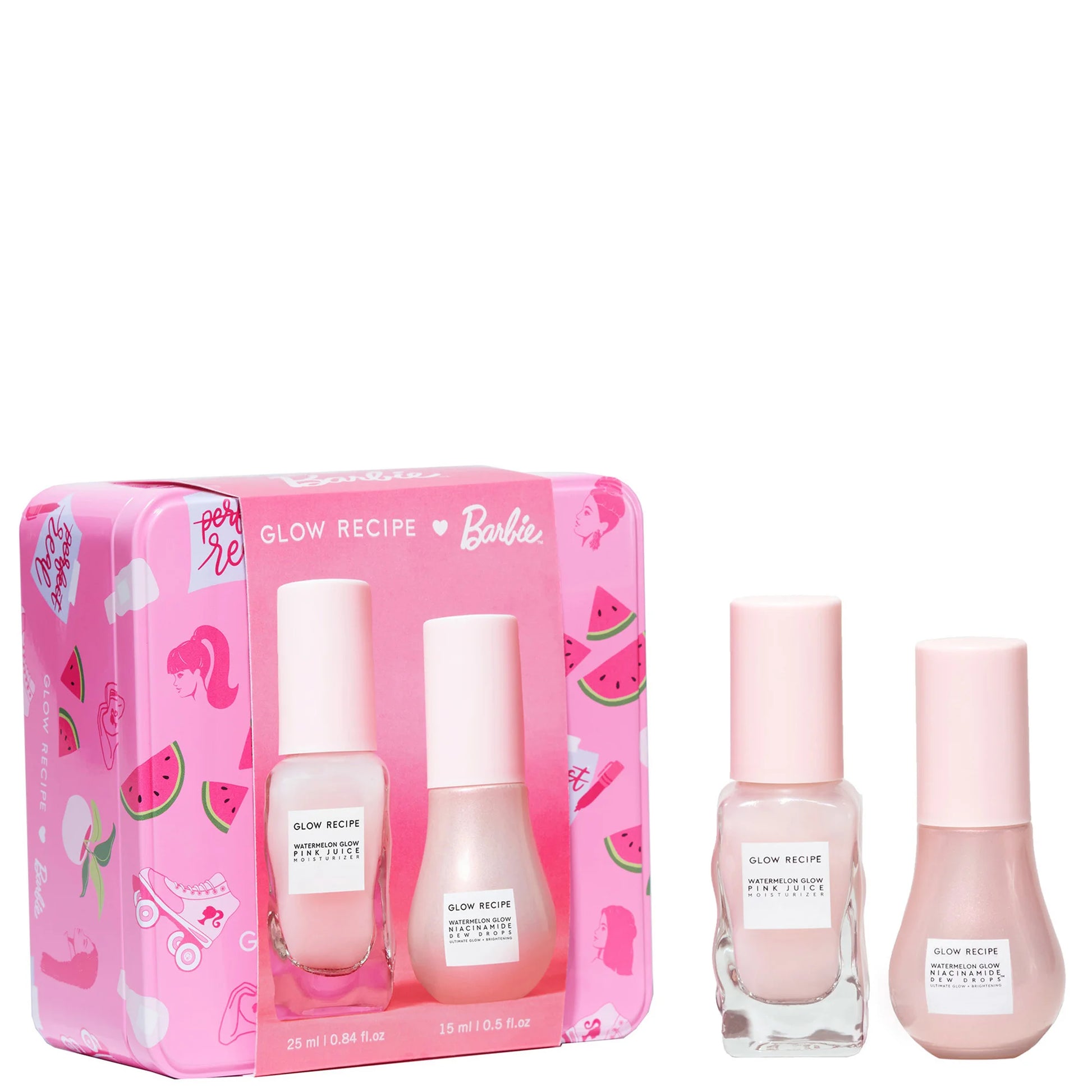 A limited‑edition collectible kit celebrating Glow Recipe x Barbie, featuring mini versions of the brand’s best‑selling watermelon-based skincare: the Watermelon Glow Niacinamide Dew Drops and the Watermelon Glow Pink Juice Oil‑Free Gel Moisturizer, all packaged in a charming Barbie-themed tin.
