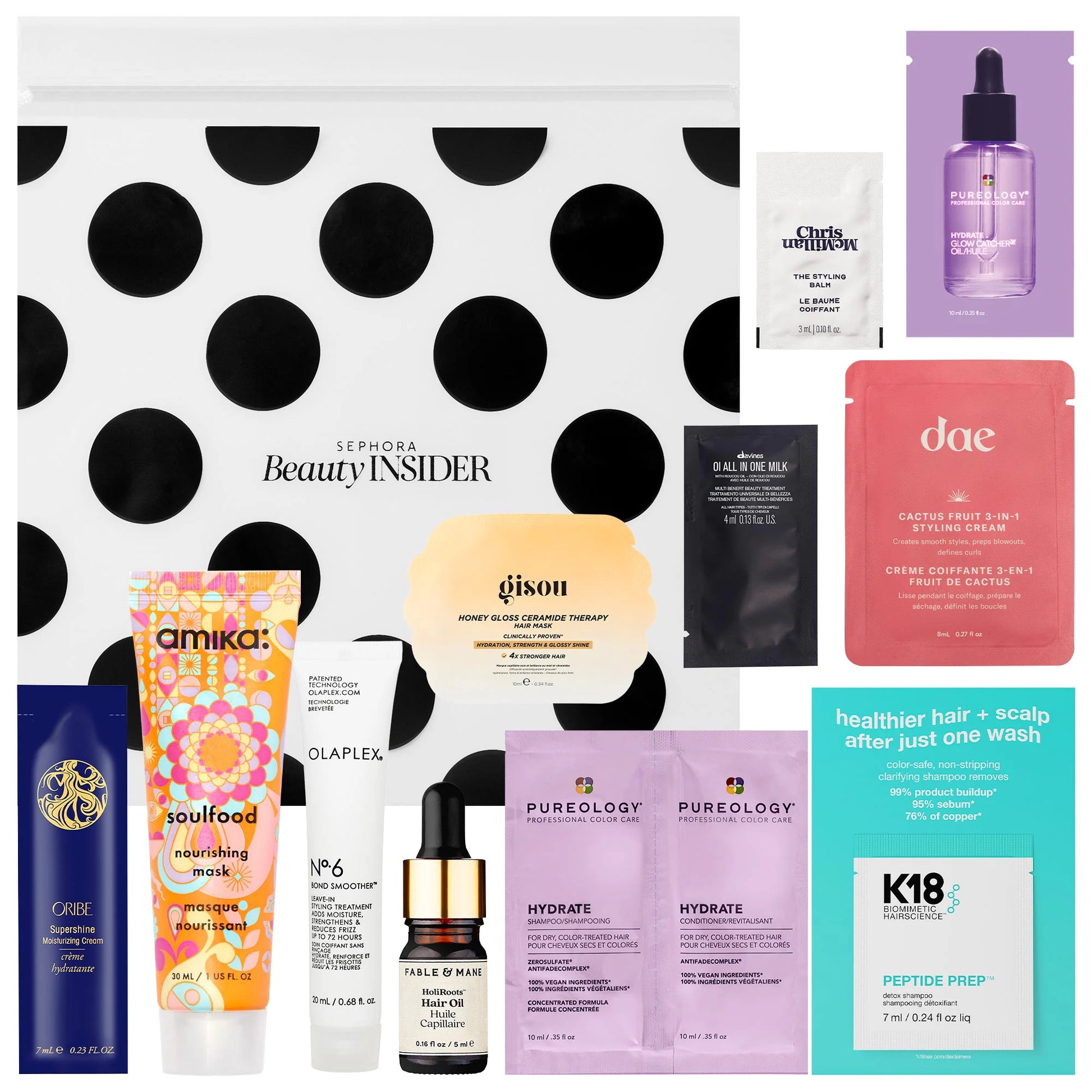 A curated haircare bag featuring a selection of Sephora haircare samples. Perfect for trying new products, travel-friendly, or discovering the best routine for healthy, shiny hair. Ideal for all hair types.
