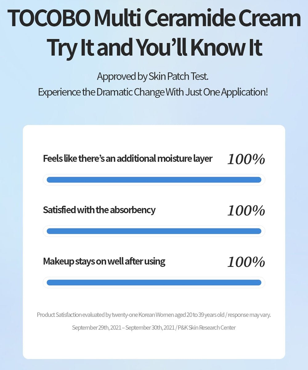 TOCOBO Multi Ceramide Cream 50ml is a deeply moisturizing cream. This cream is specially formulated to deliver moisture and leave your skin feeling soft and plump. So, its formula contains many ingredients that help to create a moisturizing film and help to boost the skin's hydration levels. First, a multi-ceramide complex helps to restore the lipids of the skin's moisture barrier, helping to retain moisture in the skin. Then, hyaluronic acid of various molecular weights and panthenol deliver and retain water in the skin, making it plumper. Last but not least, an extract of Chlorella vulgaris helps to soothe the skin and enhance the hydrating effects. This cream's texture is rich and buttery, but effortlessly absorbs into the skin. The skin becomes soft and silky, without a sticky finish. Finally, this moisturizer is suitable for sensitive skin
